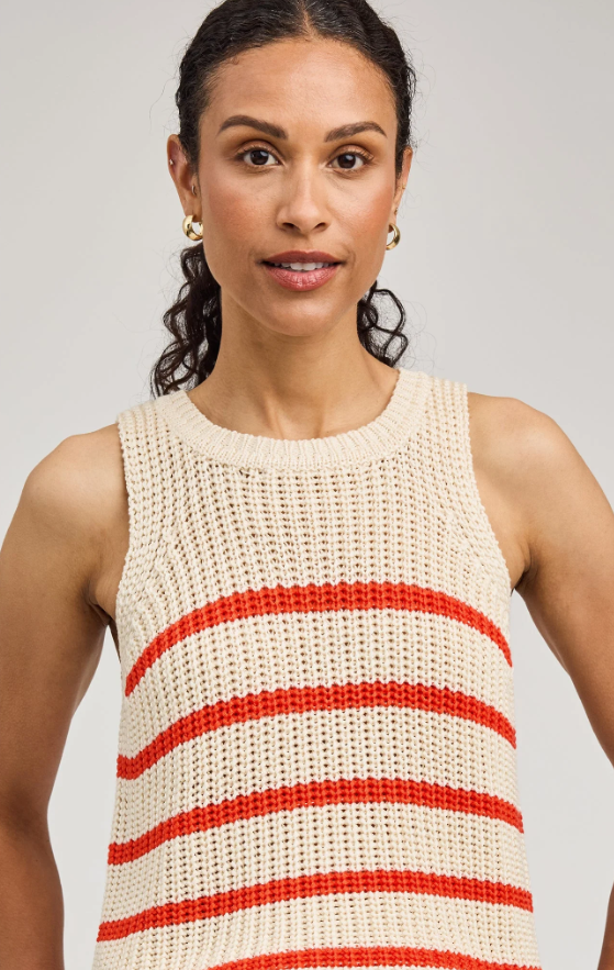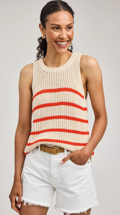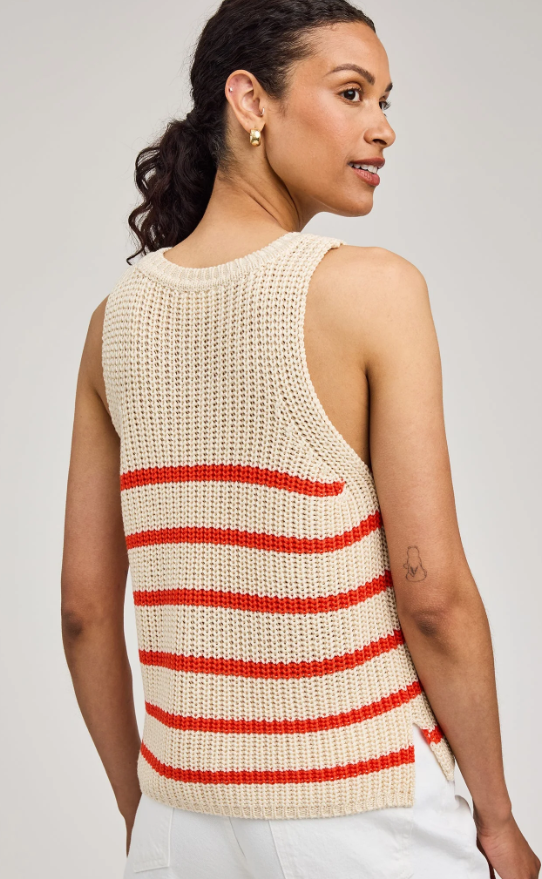 The Andrea tank is made of a soft yarn in a half cardigan stitch. Features include a crew neckline and side slits.