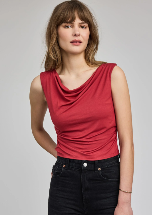 The Cassidy top is made of super soft EcoVero rayon jersey. Features include a cowl neckline and ruching at the side seams.