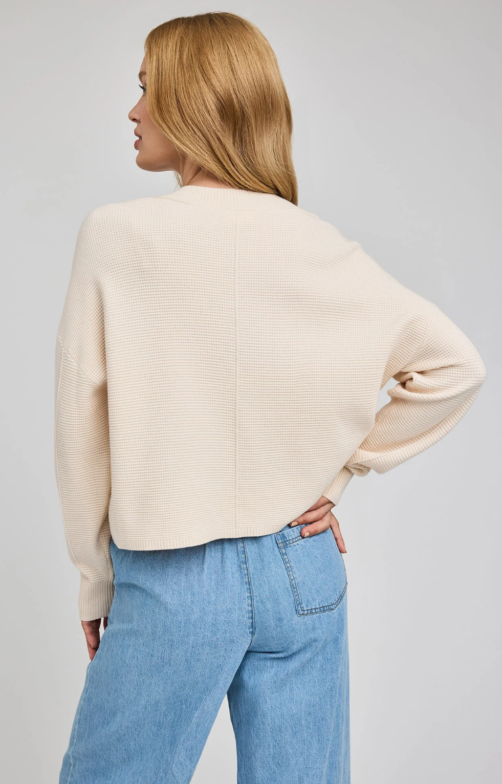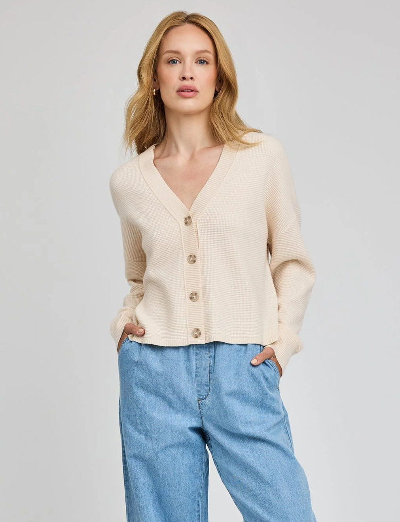 The Joyce cardigan is made of a soft yarn in a waffle stitch pattern. Features include a front button closure and exposed seam details.