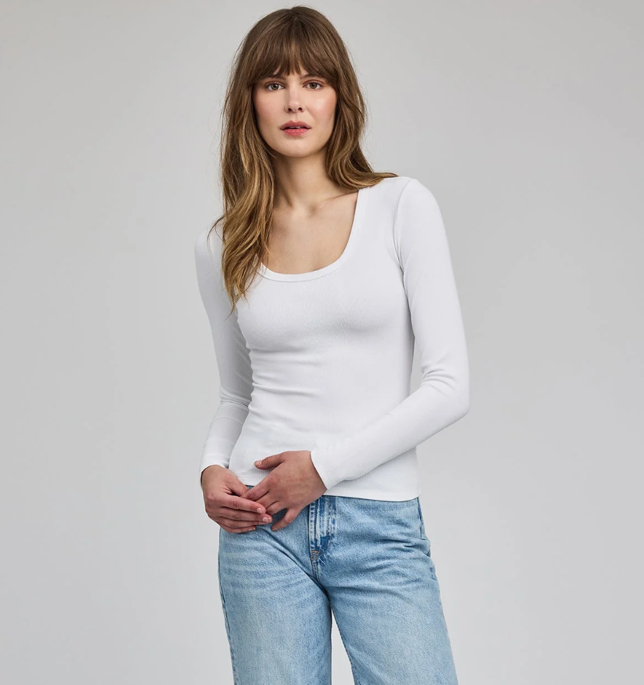 The Libby top is made of a stretchy ribbed fabric that hugs the body. The effortless scoop neckline is perfect for everyday wear or dressed up.