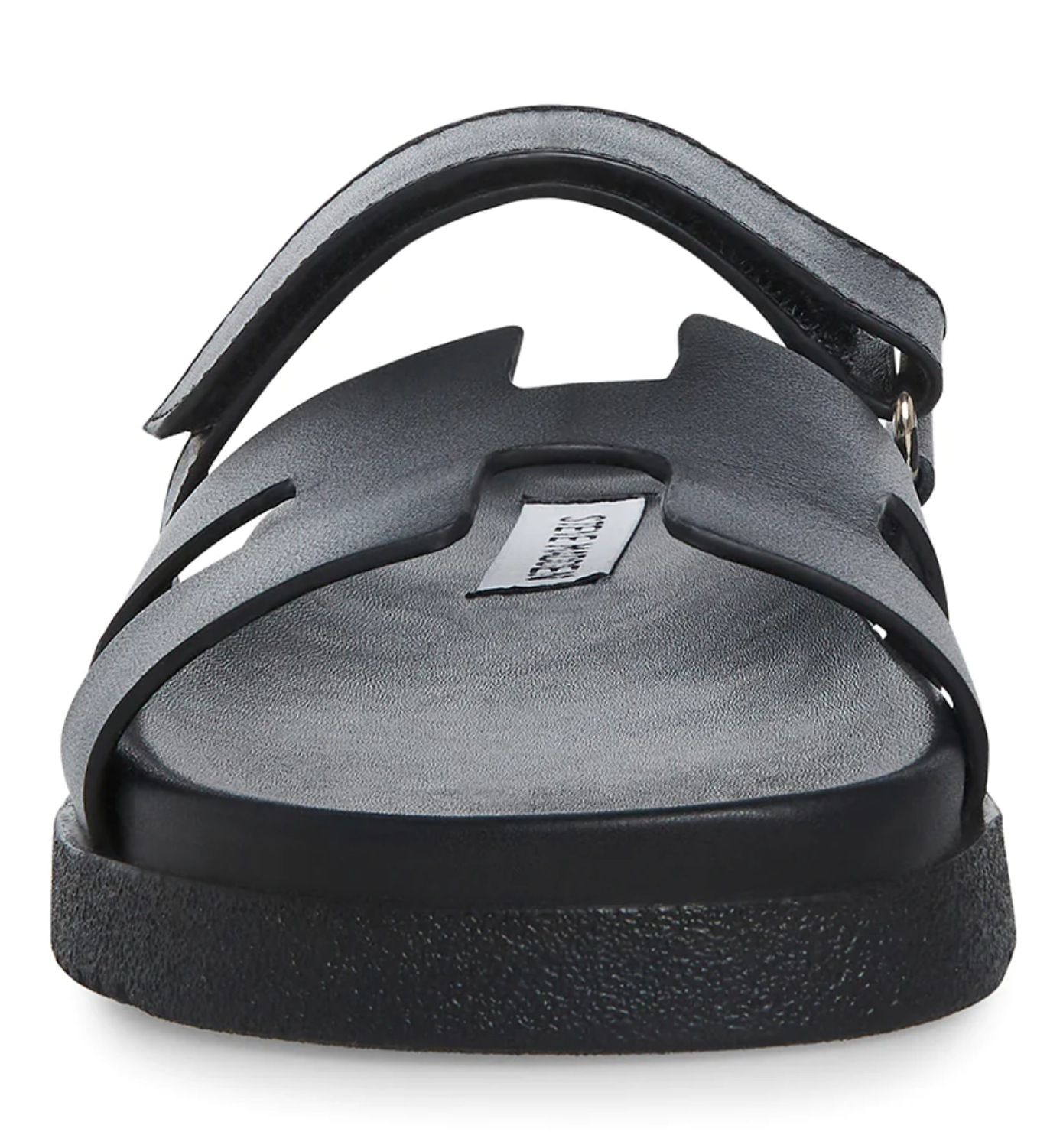 The leather MAYVEN slides feature comfy construction details like a molded footbed, a treaded flatform sole, and an adjustable top strap, plus a front strap with a geometric cutout design.