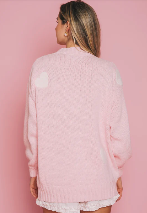 This oversized cardigan features a dropped shoulder, ribbed hems, and hidden snap closures. It’s slightly longer, hitting at the upper thigh for the perfect amount of bum coverage. With its all-over heart design, it’s seriously the cutest piece to add a touch of love and comfort to any look.