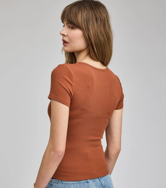 The Reagan t-shirt is made of a stretchy ribbed fabric that hugs the body. The classic crew neck tee is an essential layering piece that you'll want in every color.