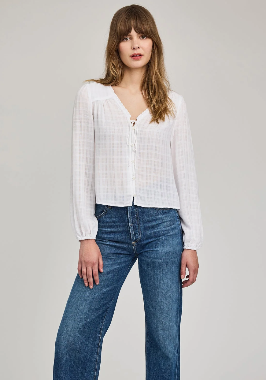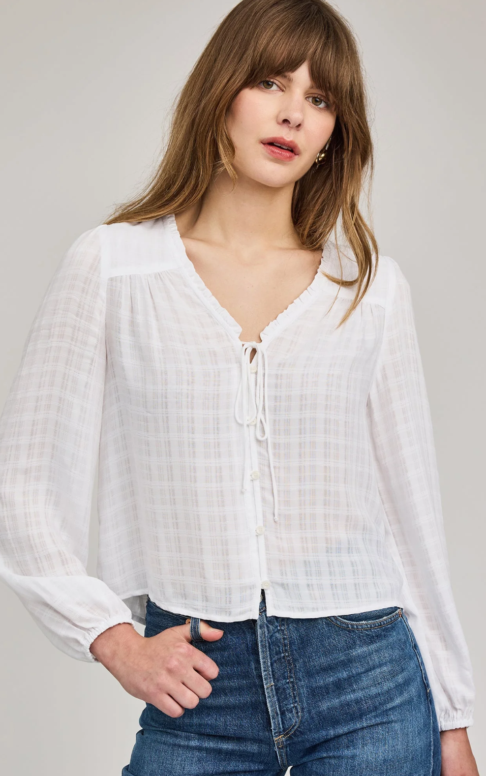 The Vanessa top is made of a textured plaid fabric. Features include a button front closure and v-neckline with delicate ruffle detailing.